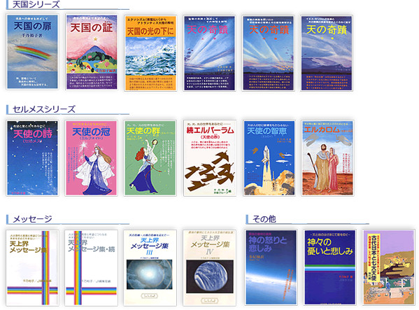 エルアール出版の出版物は、『天国の扉』『天国の証』等の「天国シリー ズ」が6冊、『天使の詩(セルメス)』『天使の冠(エルフォイド)』等の 「セルメスシリーズ」が6冊、『天上界メッセージ集』が計4冊、『神々の 憂いと悲しみ』等シリーズ外書籍が3冊ありますが、いずれも僅少本であり 現出版社が復刻版、改訂版を制作中です。現出版社の結成後は、『フェニック スの翼に乗って-新しき天の救い-』『天の奇蹟写真集天空のアート-神の業-』『天国の扉を開くマスター・キー』『天国の扉(改訂版)』『天国の証(改訂版)』『天が証された驚くべき霊界の真実1』を出版しています。